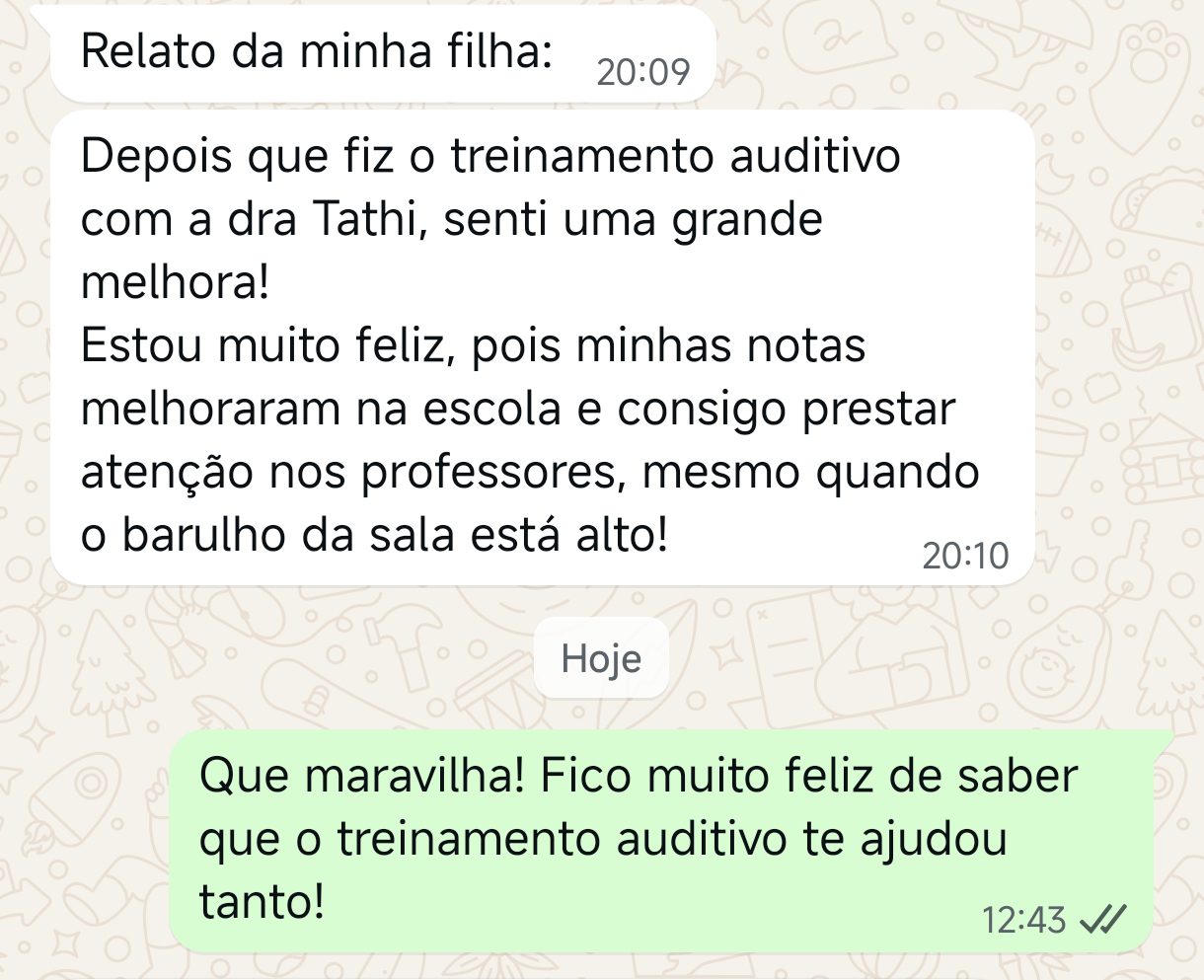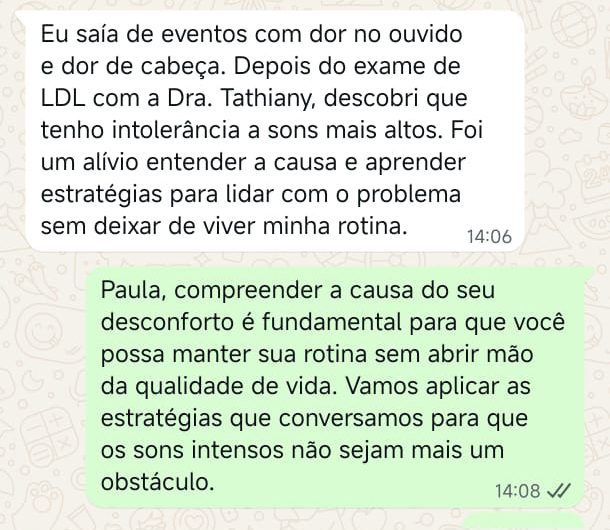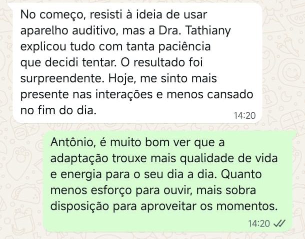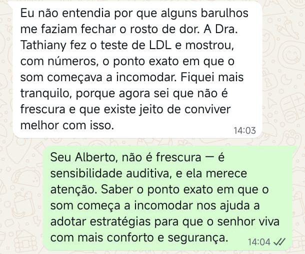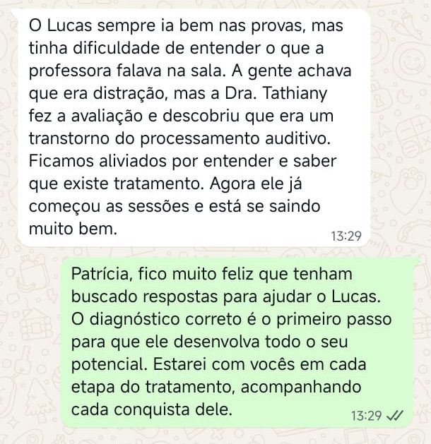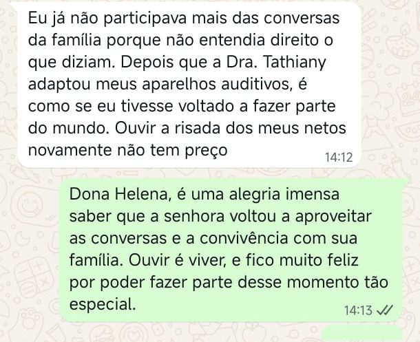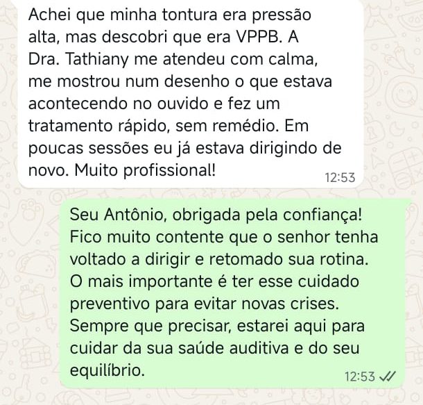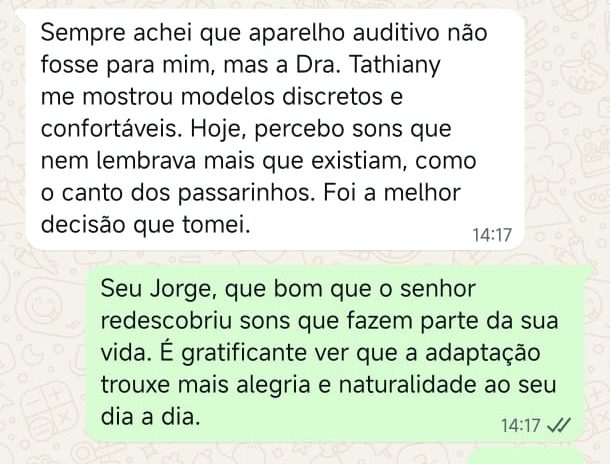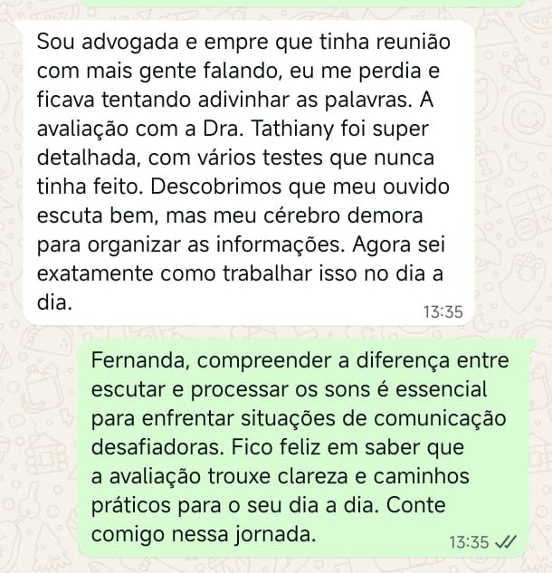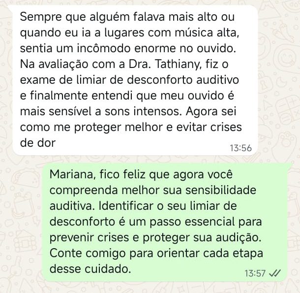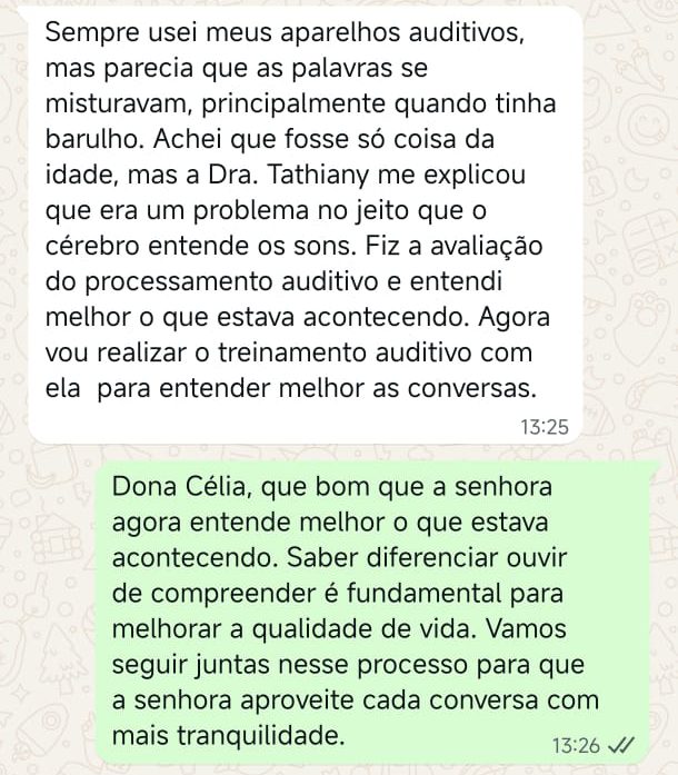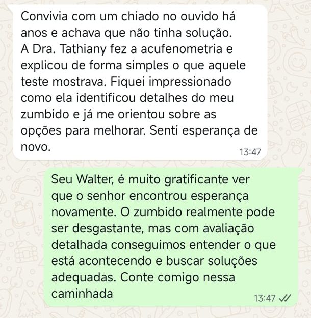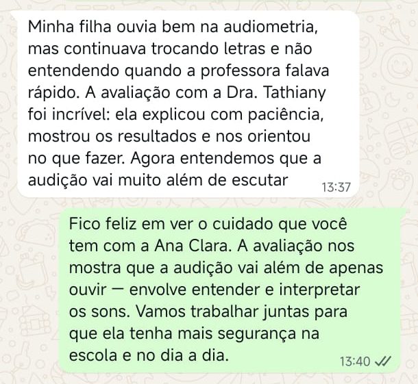 EXCELENTE Com base em 22 avaliações Publicado em Taynara TTrustindex verifica se a fonte original da avaliação é Google. A Dra. Tathiany foi fundamental no meu diagnóstico de processamento auditivo. Depois da pandemia, percebi que passei a ter muita dificuldade de compreender o que estava sendo dito pelas pessoas em locais relativamente cheios, como escritório, e por vezes achei que estava um um quadro de surdez. Fiz, inclusive, testes que sempre apontavam que tinha a audição normal. Somente com a Dra Tathiany que finalmente cheguei em um quadro e comecei a fazer a reabilitação e treinamento.Publicado em Juliana FTrustindex verifica se a fonte original da avaliação é Google. Dra. Tathi é incrível! Muito qualificada, competente, e profissional !!! Sempre nos trata com muita atenção e cuidado! Estou muito feliz com os resultados!Publicado em Lys GTrustindex verifica se a fonte original da avaliação é Google. Lugar maravilhoso com uma profissional dedicada e humana. Obrigada, Dra Tathi!Publicado em Daniele ATrustindex verifica se a fonte original da avaliação é Google. Atendimento maravilhoso. Super cuidadosa e pontual. Cheguei com muitas dúvidas e ela pacientemente soube me explicar tudo, me deixando mais tranquila. Além disso, o consultório é muito agradável.Publicado em Marina GTrustindex verifica se a fonte original da avaliação é Google. Dra. Tathi é referência no assunto e extremamente atenciosa com os pacientes! Adorei!Publicado em Daiane PTrustindex verifica se a fonte original da avaliação é Google. Muito profissional!! Atendeu minha mãe com muito carinho, nos explicou tudo e esteve sempre disponível. Maravilhosa!!Publicado em Josseline MTrustindex verifica se a fonte original da avaliação é Google. Atendimento primoroso, com cuidado e carinho.Publicado em Isabel ATrustindex verifica se a fonte original da avaliação é Google. Profissional excelentePublicado em Daniela MTrustindex verifica se a fonte original da avaliação é Google. Ontem levei meu pequeno isaac de 2 anos pra fazer o exame auditivo confesso que fui um pouco nervosa mas chegando lá fiquei muito tranquila um exerlente atendimento doutora tem uma experiência incrível isaac ficou avontade na sala e uma profissional muito competente adorei fui bem acolhida com meu filho tá de parabénsPublicado em Aparecida STrustindex verifica se a fonte original da avaliação é Google. Atendimento impecável! Obrigada!!