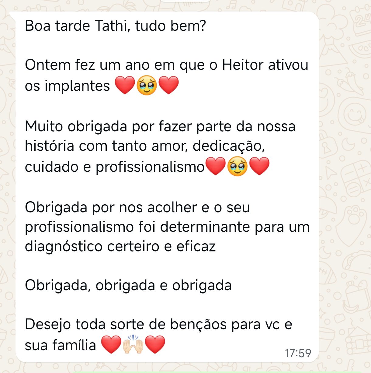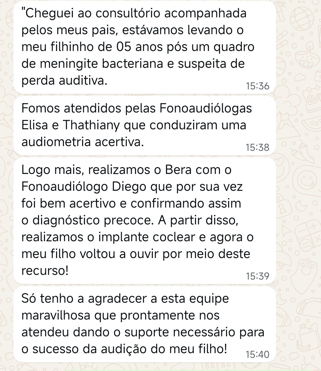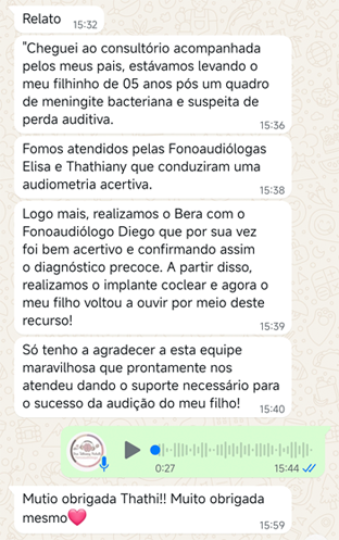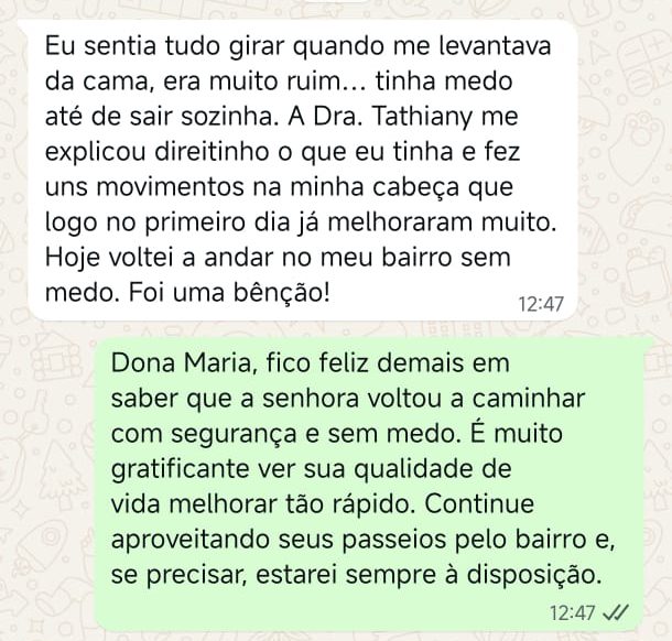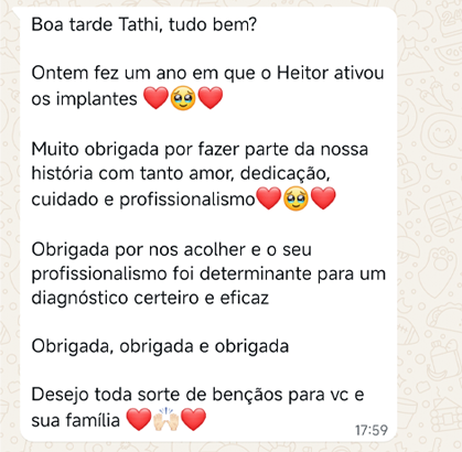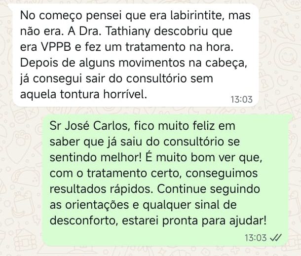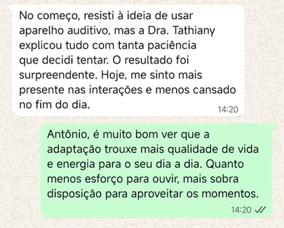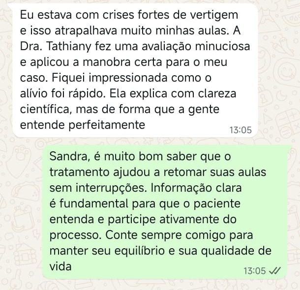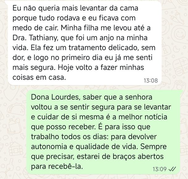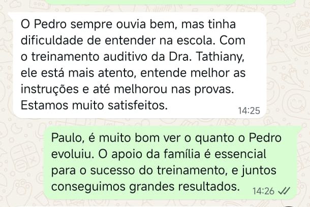 EXCELENTE Com base em 22 avaliações Publicado em Taynara TTrustindex verifica se a fonte original da avaliação é Google. A Dra. Tathiany foi fundamental no meu diagnóstico de processamento auditivo. Depois da pandemia, percebi que passei a ter muita dificuldade de compreender o que estava sendo dito pelas pessoas em locais relativamente cheios, como escritório, e por vezes achei que estava um um quadro de surdez. Fiz, inclusive, testes que sempre apontavam que tinha a audição normal. Somente com a Dra Tathiany que finalmente cheguei em um quadro e comecei a fazer a reabilitação e treinamento.Publicado em Juliana FTrustindex verifica se a fonte original da avaliação é Google. Dra. Tathi é incrível! Muito qualificada, competente, e profissional !!! Sempre nos trata com muita atenção e cuidado! Estou muito feliz com os resultados!Publicado em Lys GTrustindex verifica se a fonte original da avaliação é Google. Lugar maravilhoso com uma profissional dedicada e humana. Obrigada, Dra Tathi!Publicado em Daniele ATrustindex verifica se a fonte original da avaliação é Google. Atendimento maravilhoso. Super cuidadosa e pontual. Cheguei com muitas dúvidas e ela pacientemente soube me explicar tudo, me deixando mais tranquila. Além disso, o consultório é muito agradável.Publicado em Marina GTrustindex verifica se a fonte original da avaliação é Google. Dra. Tathi é referência no assunto e extremamente atenciosa com os pacientes! Adorei!Publicado em Daiane PTrustindex verifica se a fonte original da avaliação é Google. Muito profissional!! Atendeu minha mãe com muito carinho, nos explicou tudo e esteve sempre disponível. Maravilhosa!!Publicado em Josseline MTrustindex verifica se a fonte original da avaliação é Google. Atendimento primoroso, com cuidado e carinho.Publicado em Isabel ATrustindex verifica se a fonte original da avaliação é Google. Profissional excelentePublicado em Daniela MTrustindex verifica se a fonte original da avaliação é Google. Ontem levei meu pequeno isaac de 2 anos pra fazer o exame auditivo confesso que fui um pouco nervosa mas chegando lá fiquei muito tranquila um exerlente atendimento doutora tem uma experiência incrível isaac ficou avontade na sala e uma profissional muito competente adorei fui bem acolhida com meu filho tá de parabénsPublicado em Aparecida STrustindex verifica se a fonte original da avaliação é Google. Atendimento impecável! Obrigada!!